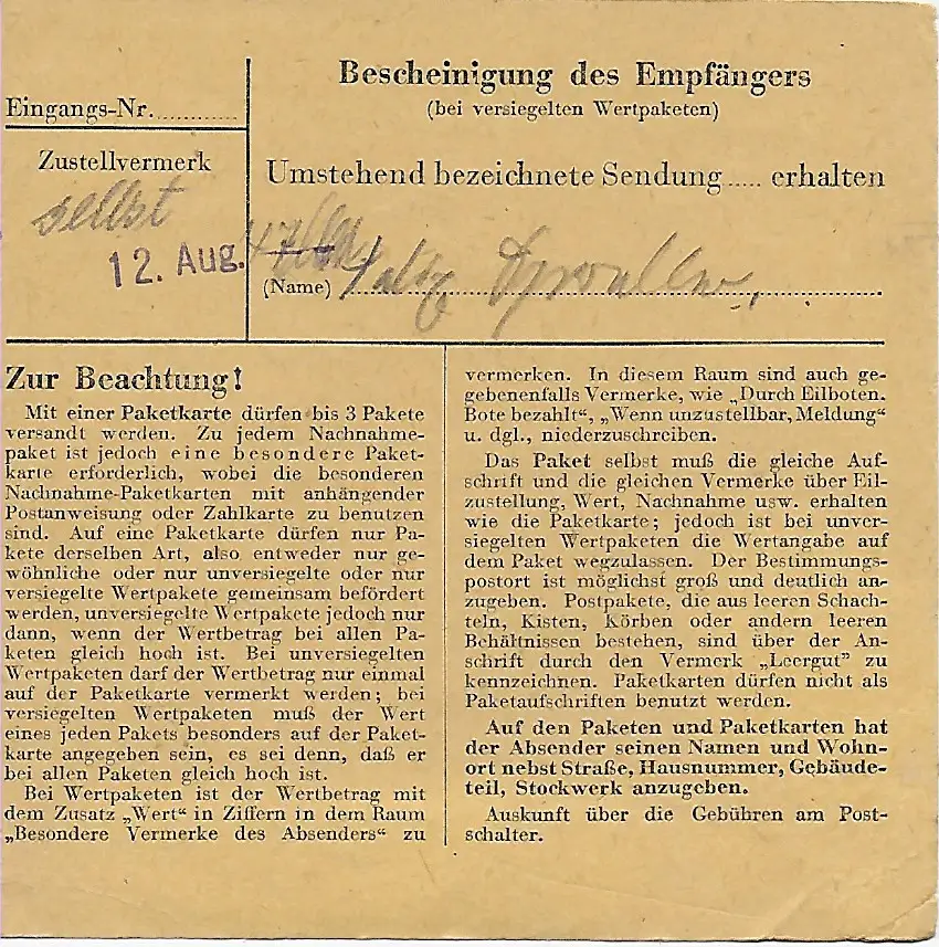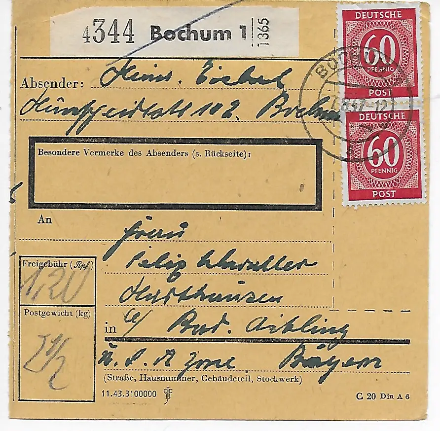 Carte de paquet Bochum vers Bad Aibling, 1947, MeF