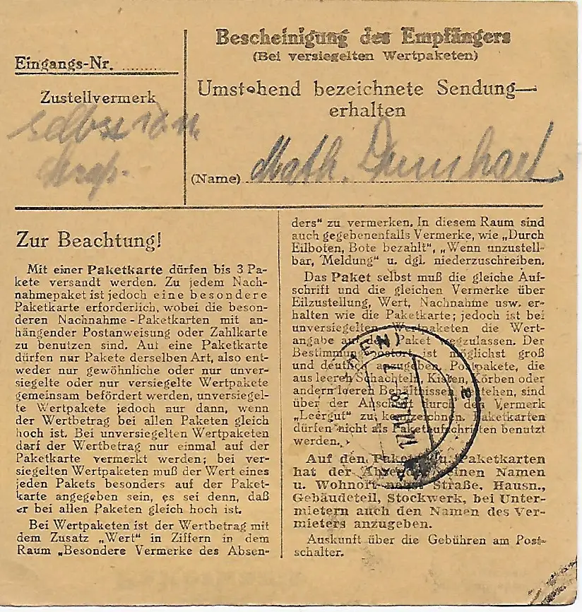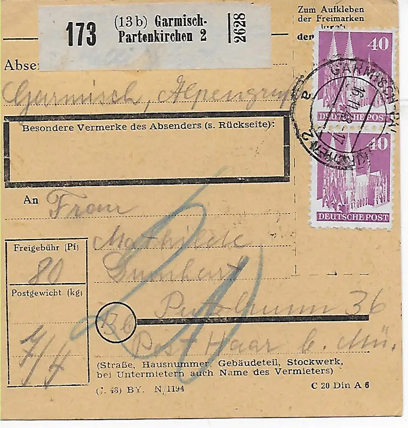 Carte de paquet Garmisch-Partenkirchen, Frais de port 20, 1948, MeF
