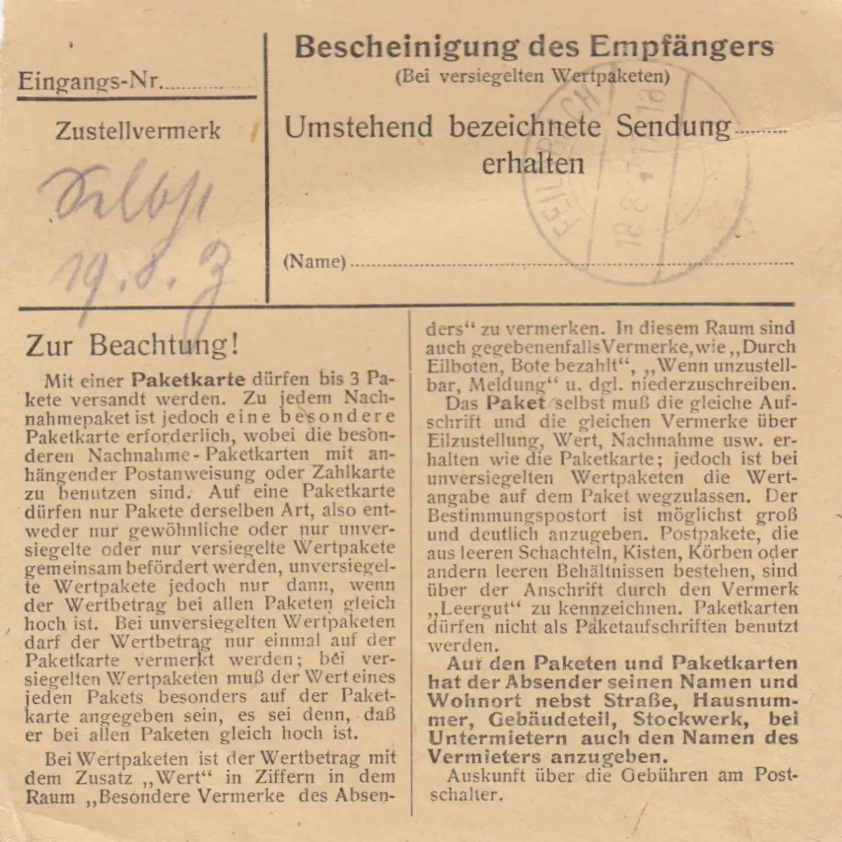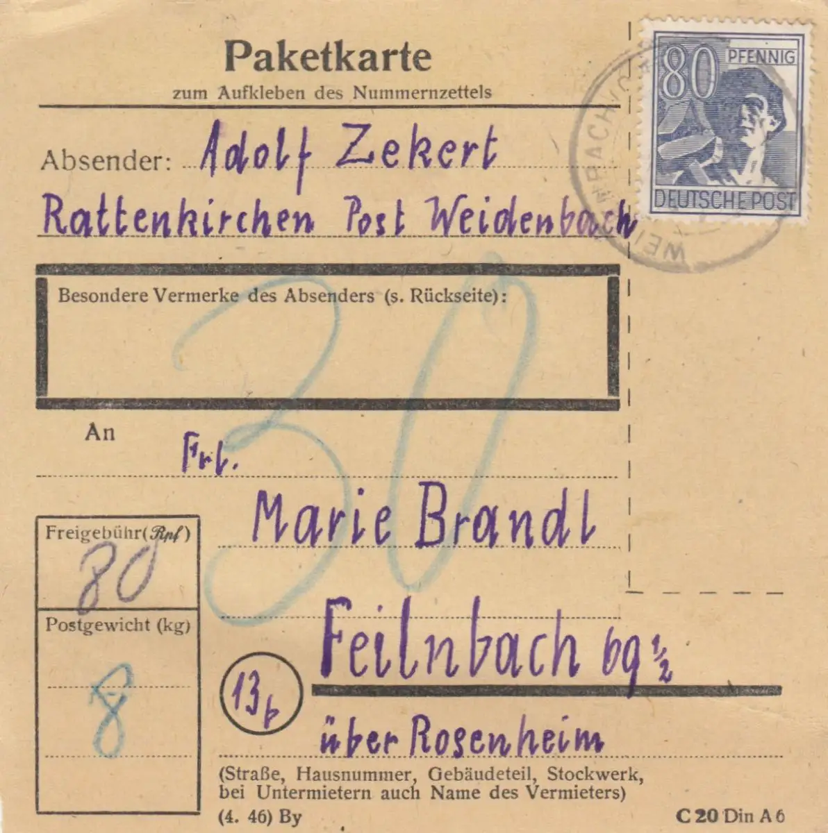 Carte de paquet: Ratzkirchen Post Weidenbach vers Feilnbach
