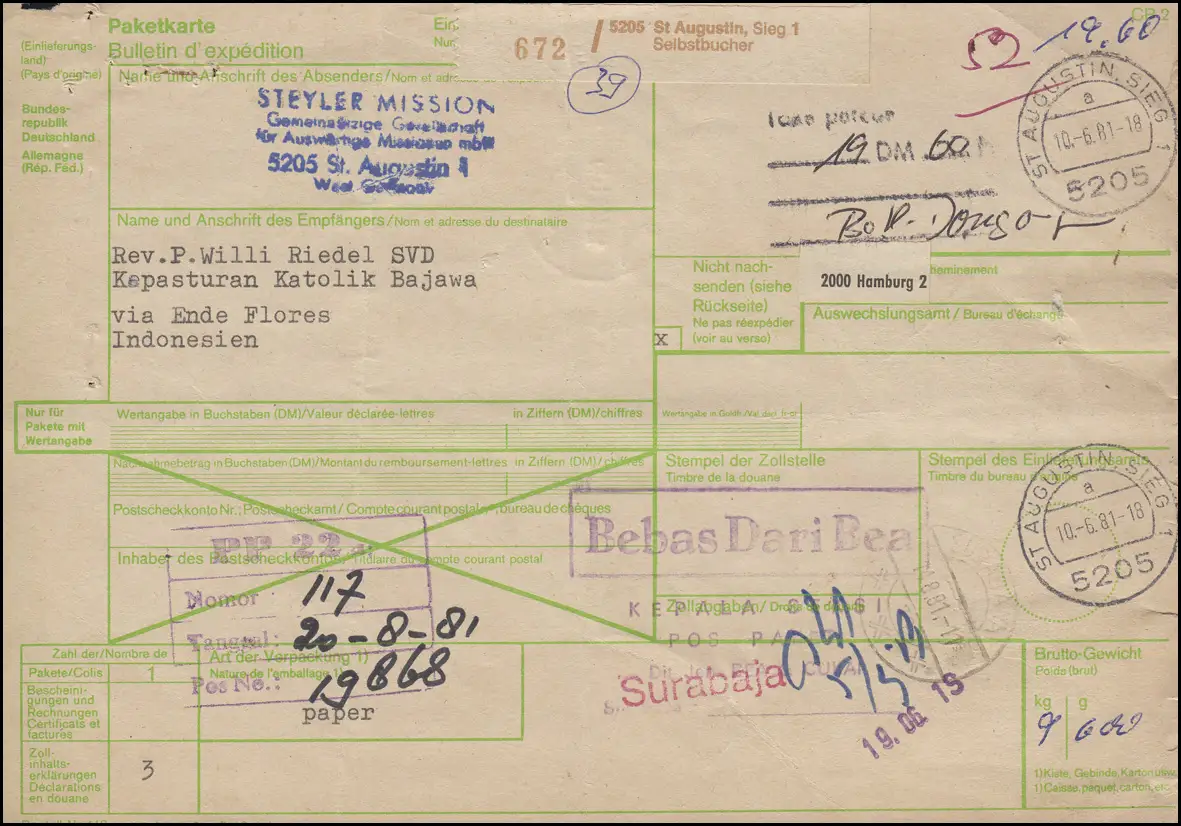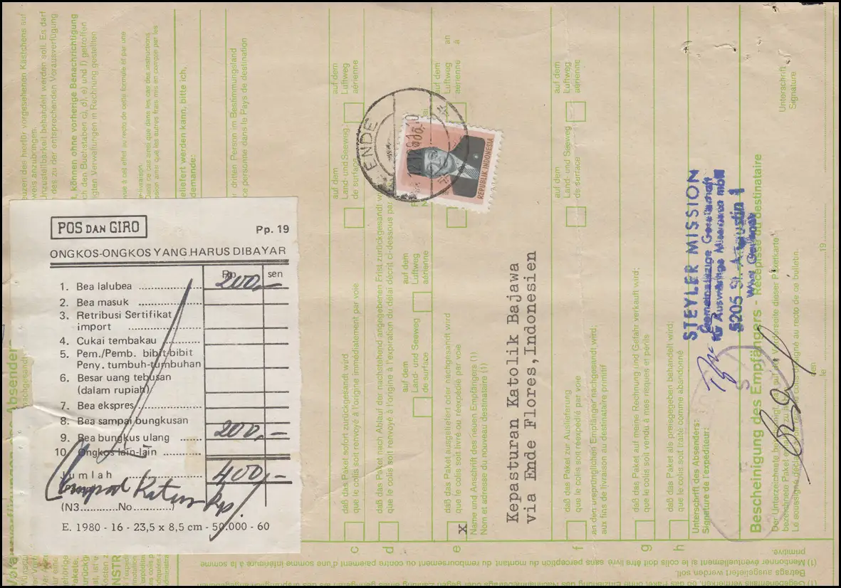 et via SURABAJA 14.8.81, de la MISSION STYLER, avec le temple et le billet de douane correspondants ainsi que la marque de port arrière de l'Indonésie Contrôle: original Référence: 00000000012407>Remarque: Cet article n'est disponible qu'une seule fois. Vous recevrez exactement l 'article représenté.
