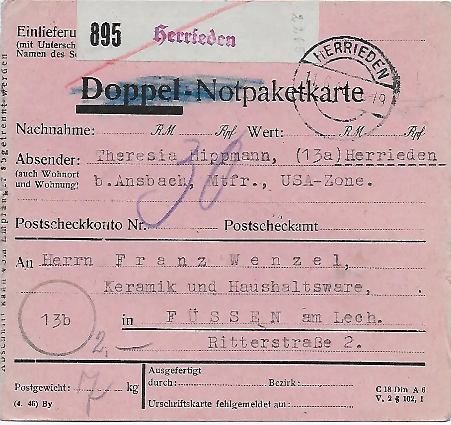 Carte de paquet d'urgence de Herrieden à Pieds, 1948, EF Mi Nr. 960