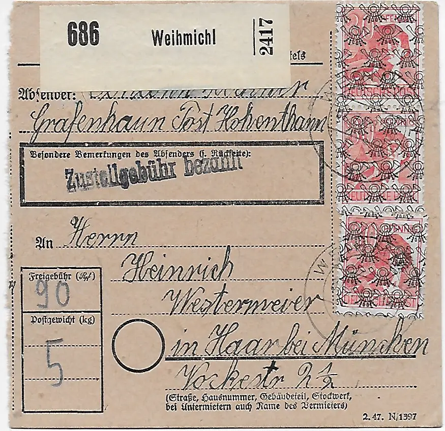 Carte de paquets Weihmichl vers Egelfing, 1948, 46II, MeF, lettres de poste de terrain arrière