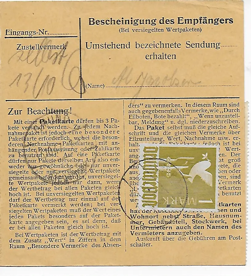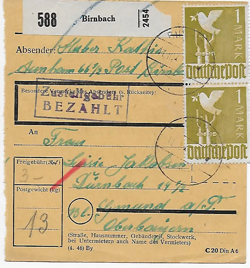 Carte de paquets de Birnbach d'après Gmund a. T., 1948, MeF MiNr. 959