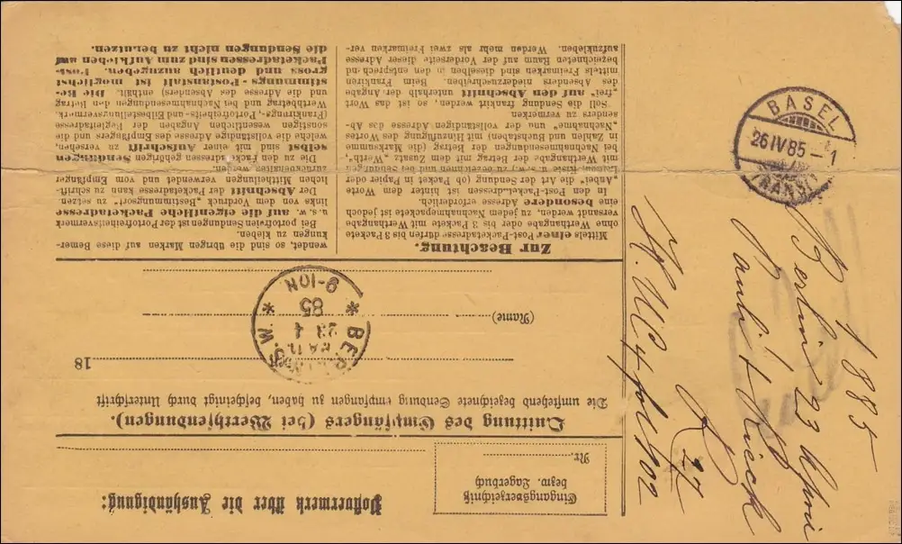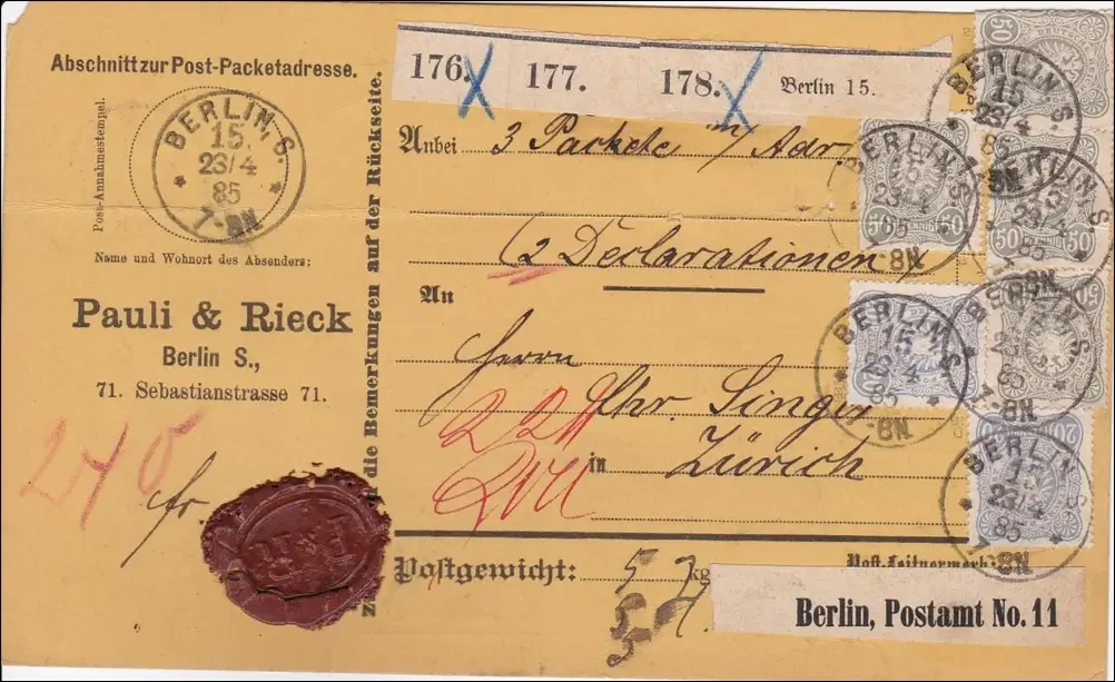 Carte de paquets pour 3 paquetages livrés de Berlin à Zurich 1885