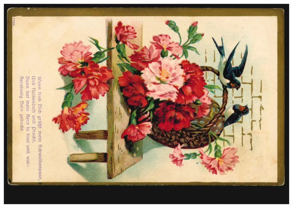 Carte de pré-enchantement Poème Panier d'oeillets avec paire d hirondelles, RATH HEUMAR 26.7.1909