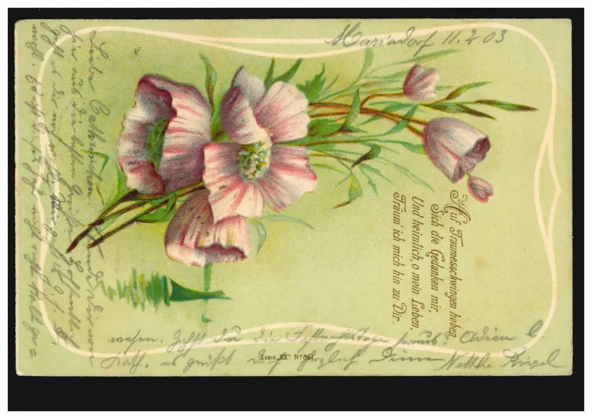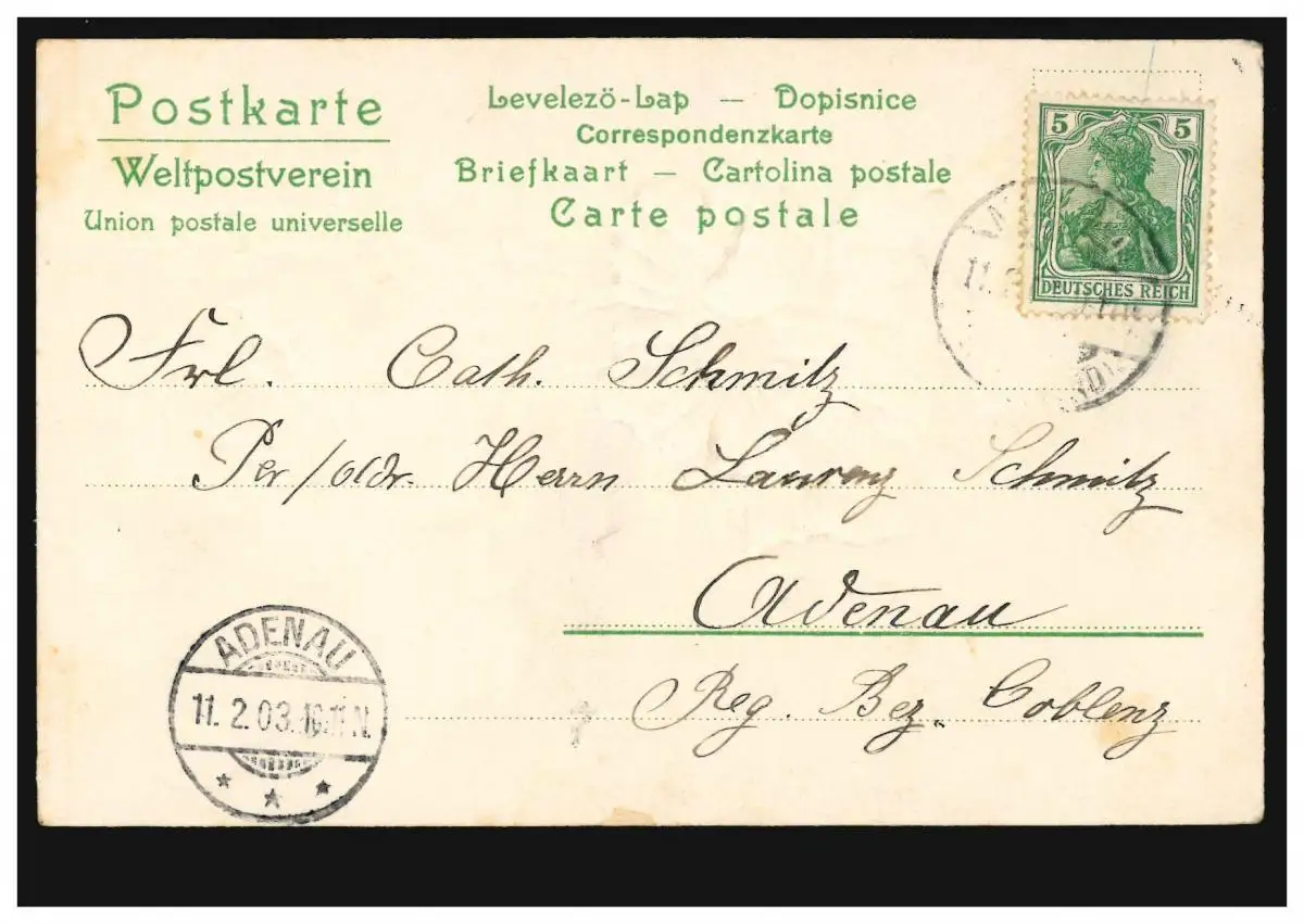 Carte de prédilection poème d'amour avec des fleurs avant les lacs, après ADENAU 11.2.1903