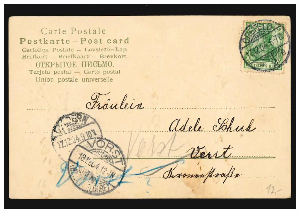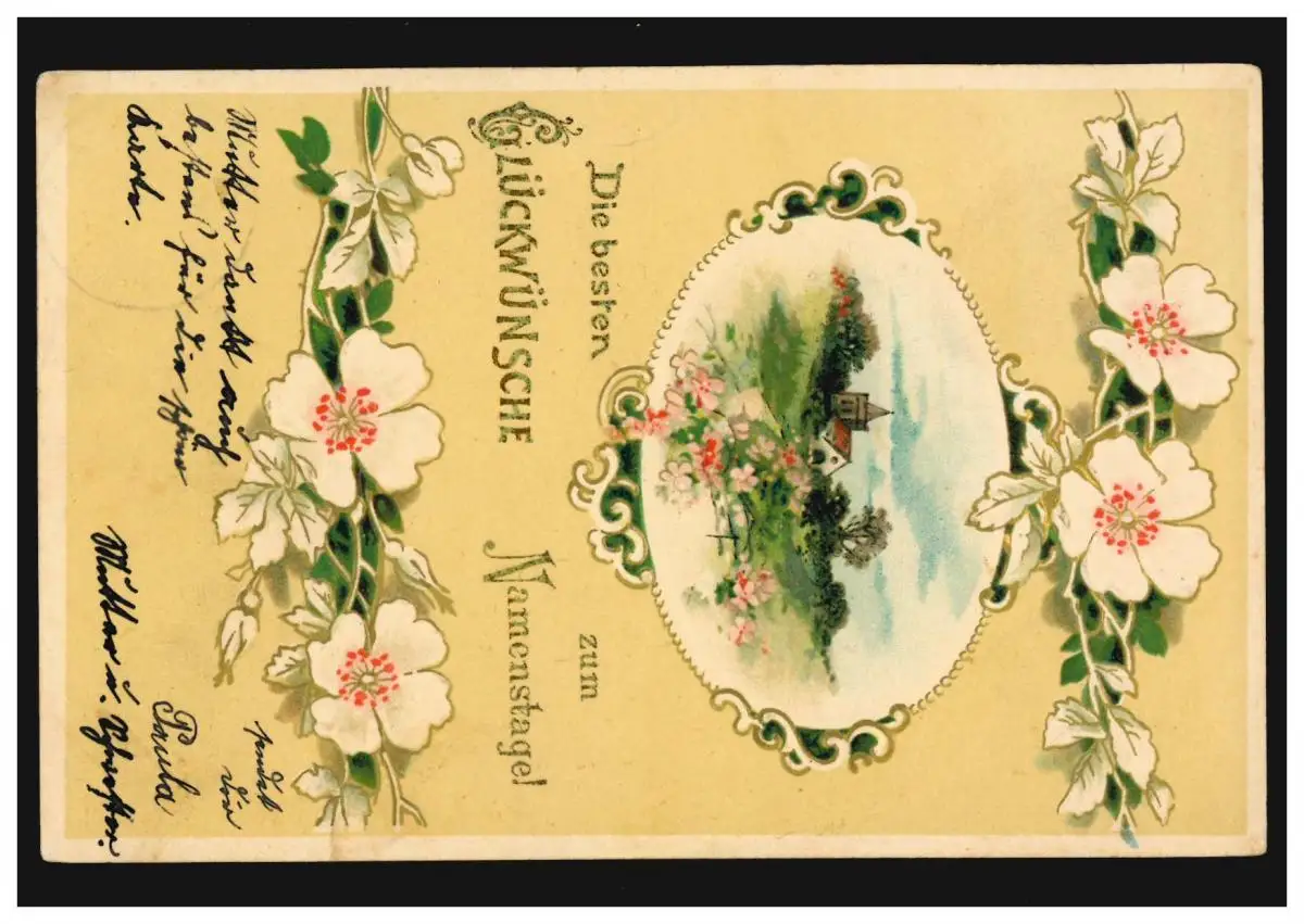 Carte de prénom Jour de la fête Paysage avec cadre floral, CREFELD 17.12.1904