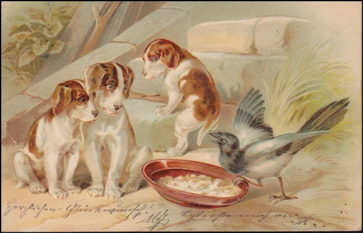 Carte de présentation Elster vole la nourriture des chiots de chien, BREYELL 4.7.1903