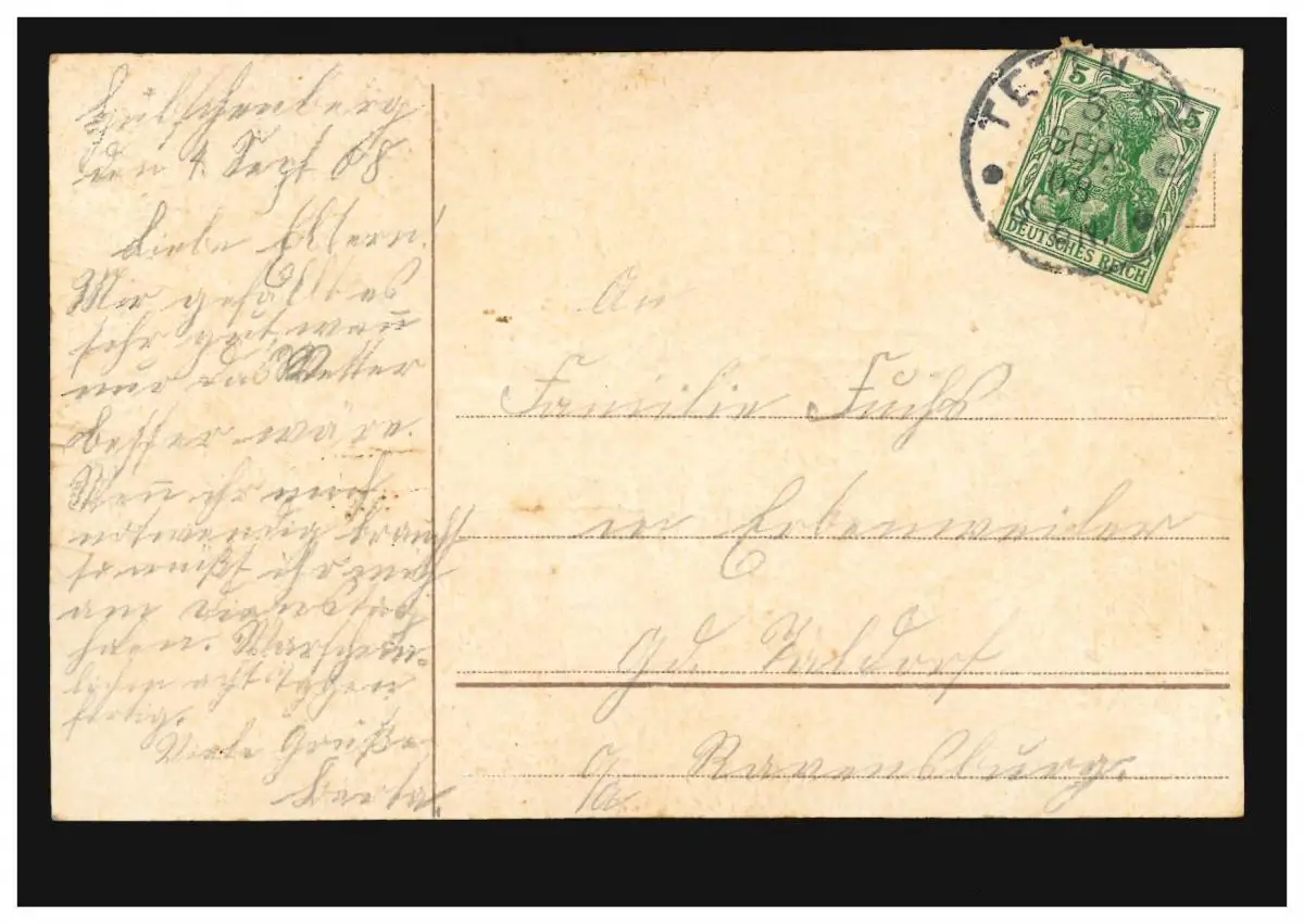 Carte de présentation Trois filles sur l'échelle avec des fleurs et une lettre, TETTNANG 5.9.1908