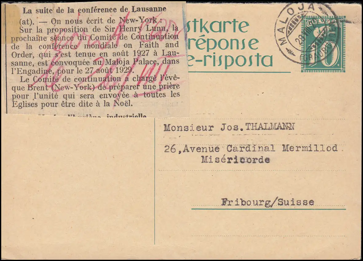 Carte de réponse Valeur avec pigeon 10 C. MALOJA (GRAUBE) 28.8.1929