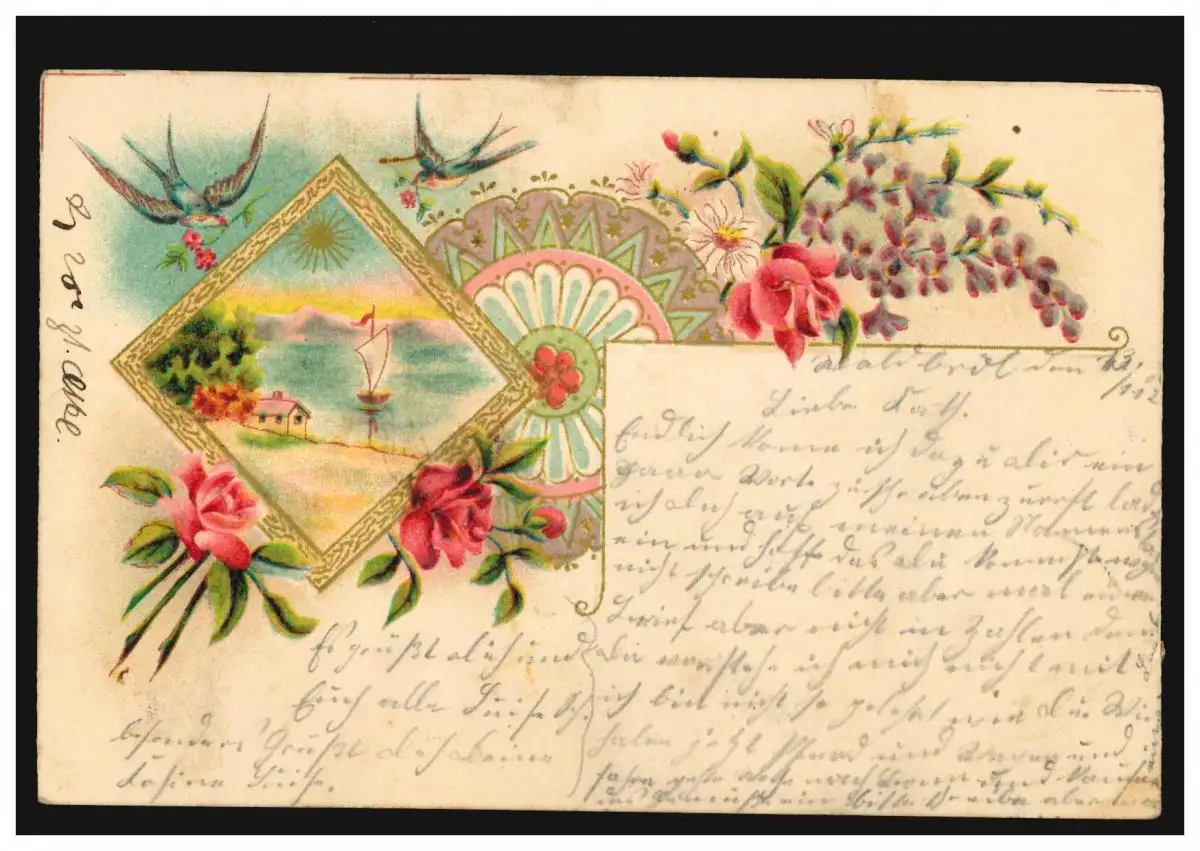 Carte de vacances paysage de plage avec hirondelles et fleurs,WALDBRÖL 13.11.1902