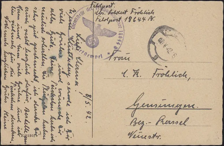 Carte de vue Dans la laande Feldpost BS Field post numéro 18644B et jour-O 10.5.42