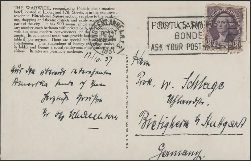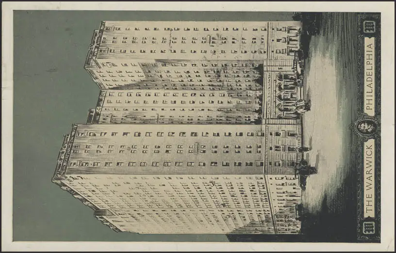 Carte de vue États-Unis: L'hôtel Warwick à Philadelphie, couru 17.10.1937