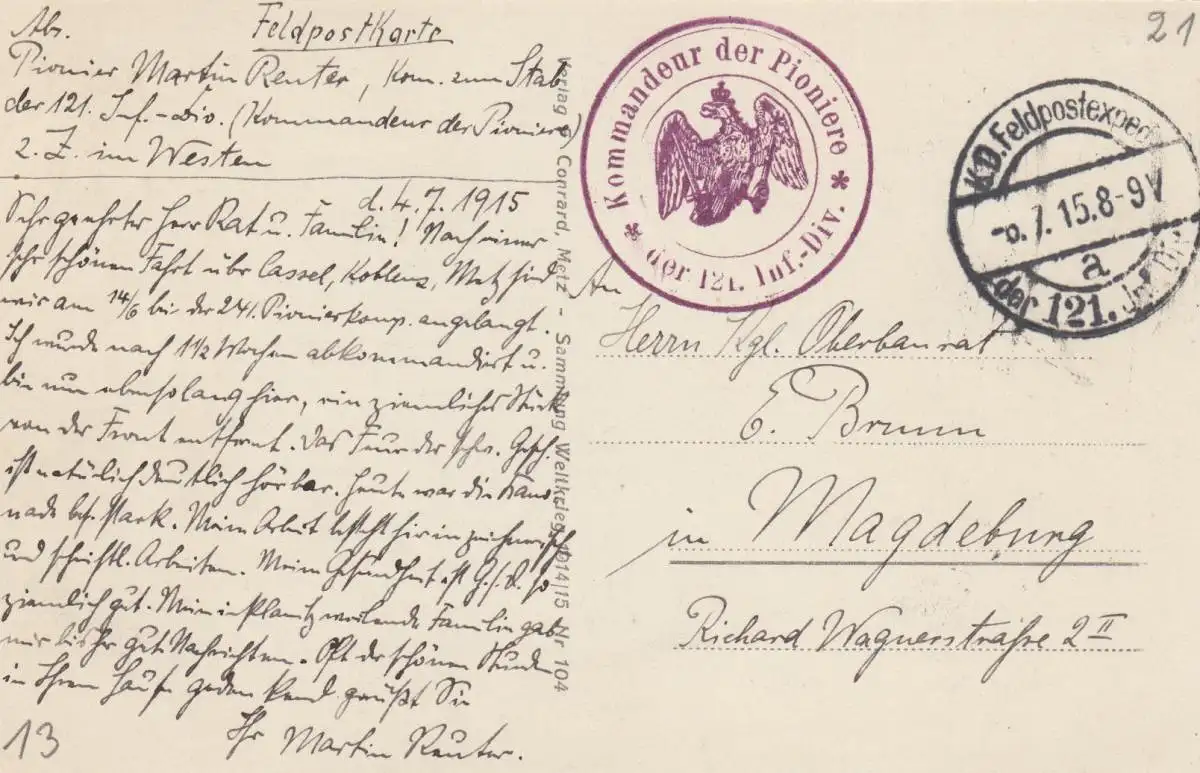 Carte de vue France Roye, commandant du poste de terrain des pionniers 1915