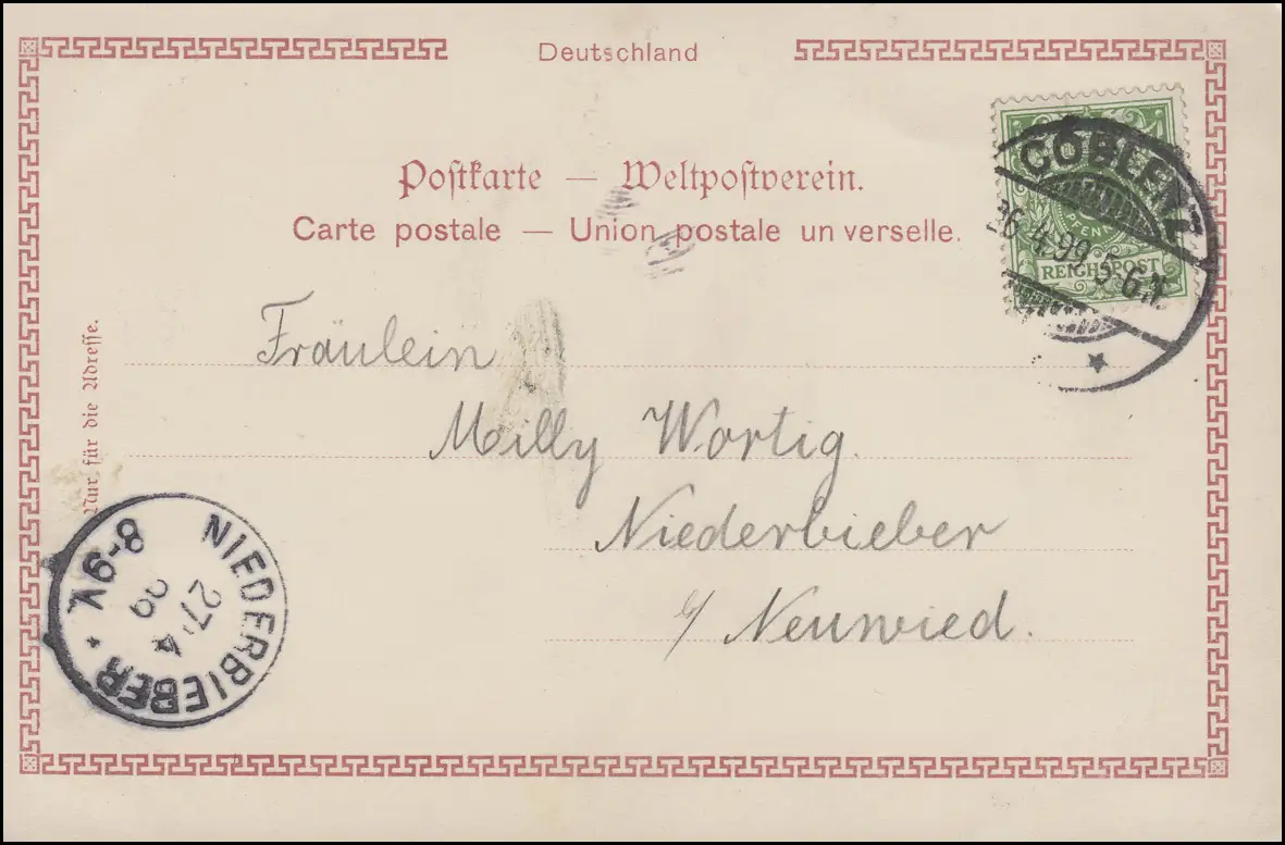 Carte de vue Germania-Ensemble, COMLENZ 26.4.1899 d'après NIEDERBIEBER 27.4.189