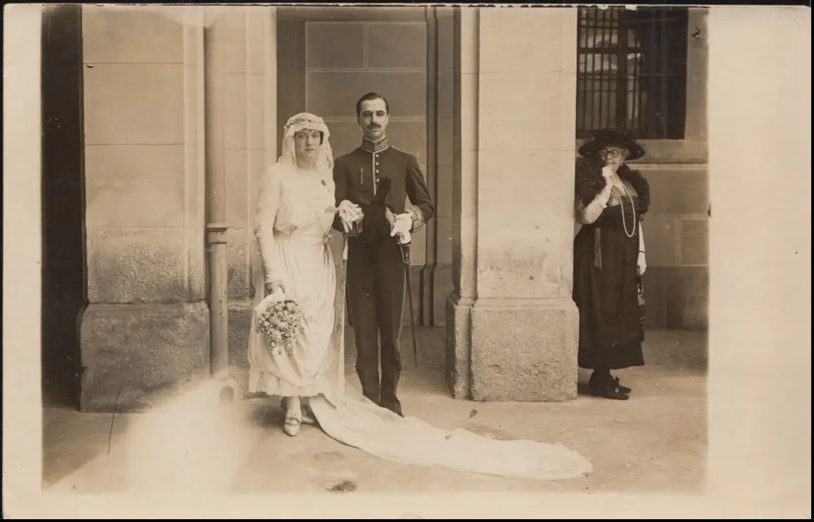 Carte de vue Le couple marié avec belle-mère rire, CLÔT 19.7.1920
