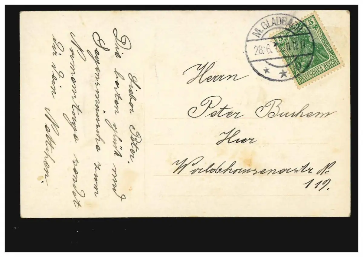 Carte de vue Nom de la femme avec panier de fleurs, colorié. M.GLADBACH 28.6.1913