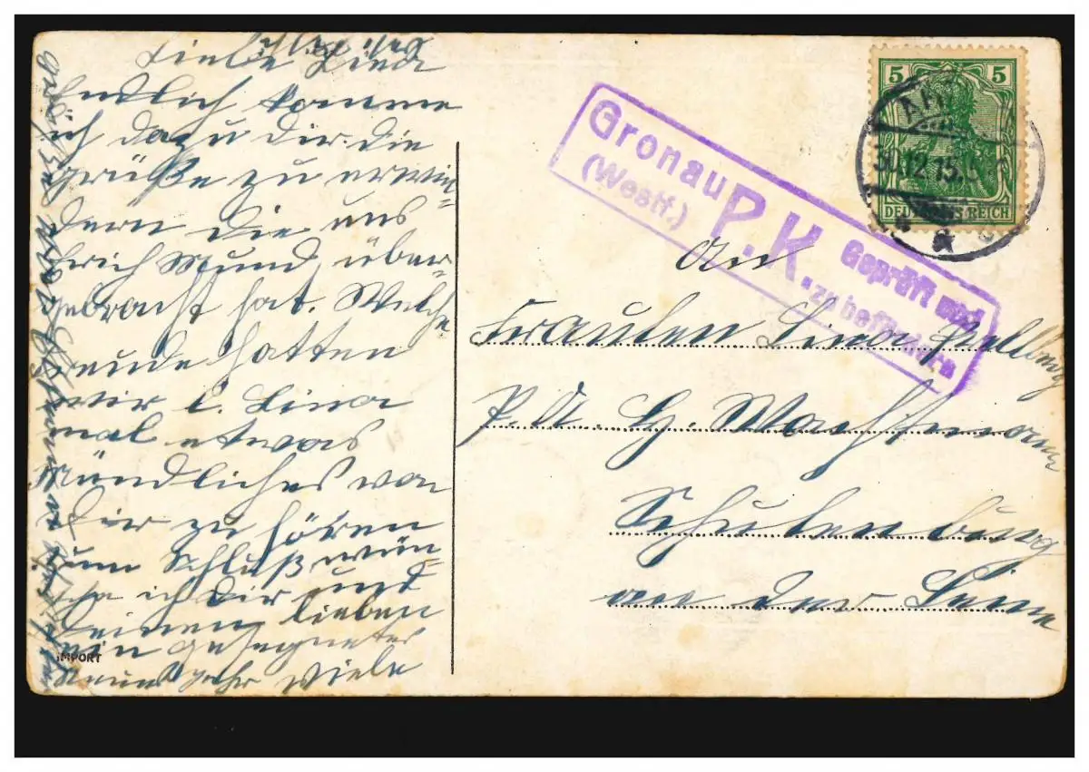 Carte de vue Nouvel An chasseur sur le Pirsch / fer à cheval, censure P.K. Gronau 1915