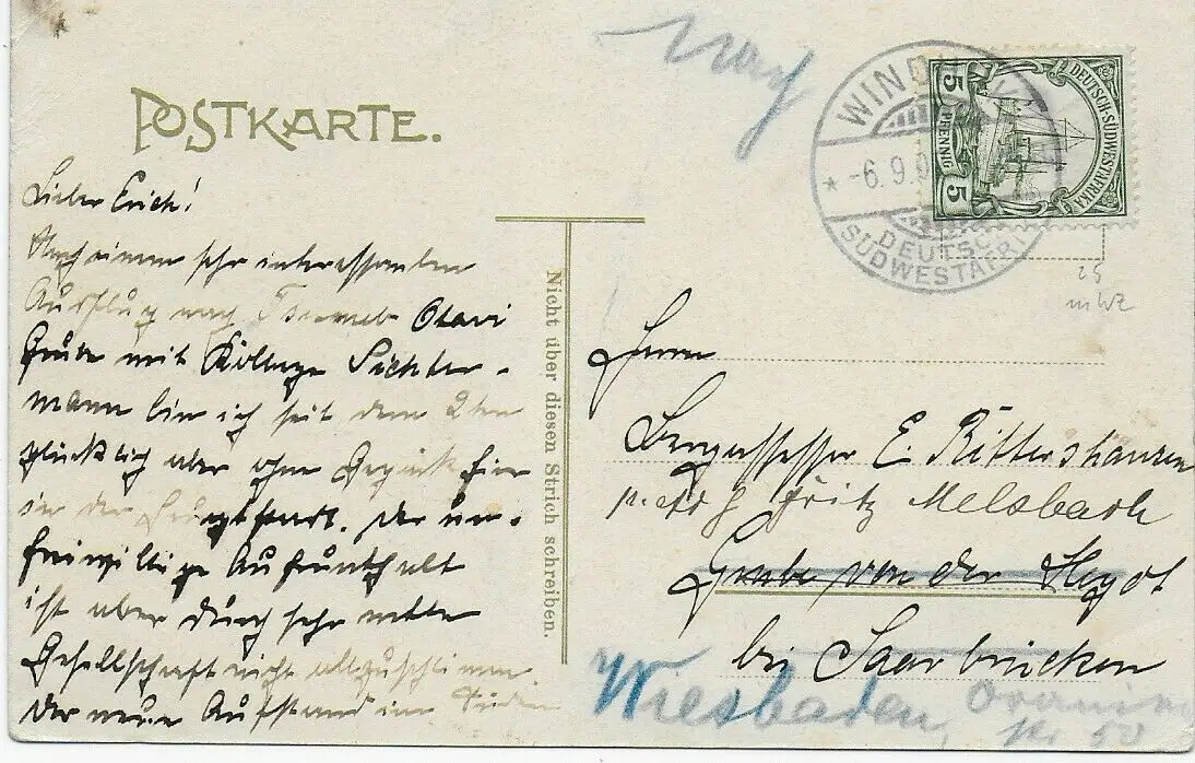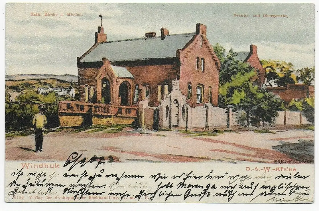 Carte de vue Windhuk, tribunal de district et tribunal supérieur, 1907 vers Wiesbaden/Saarbrücken