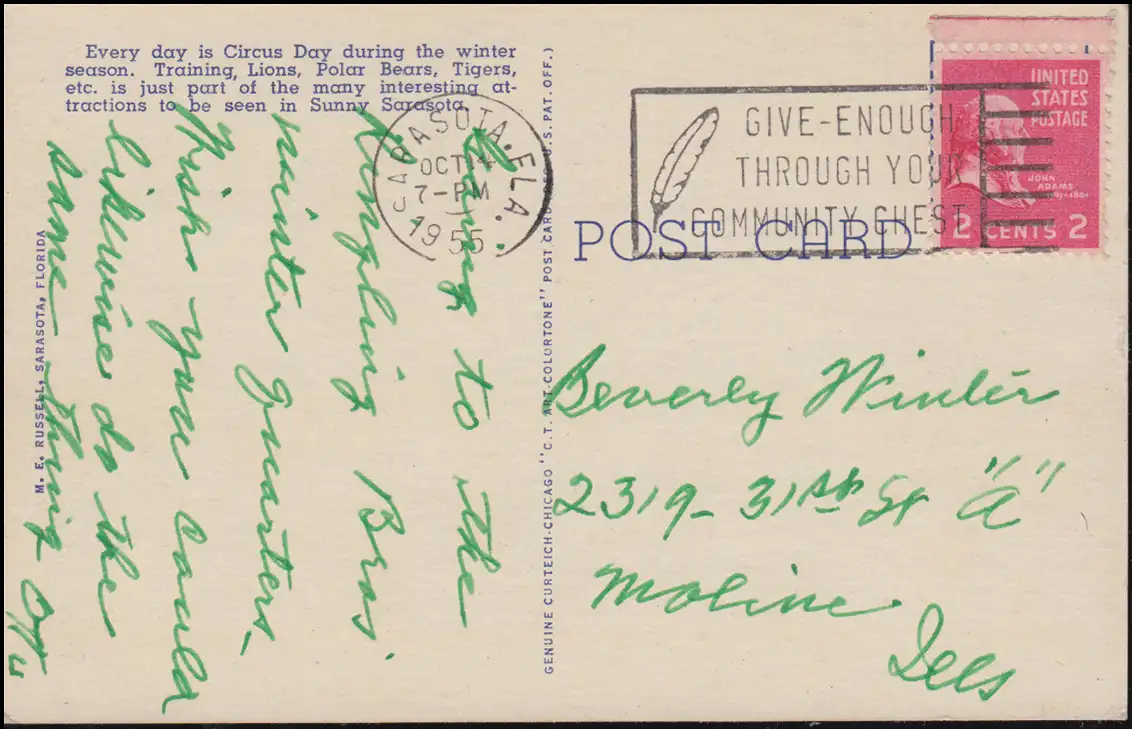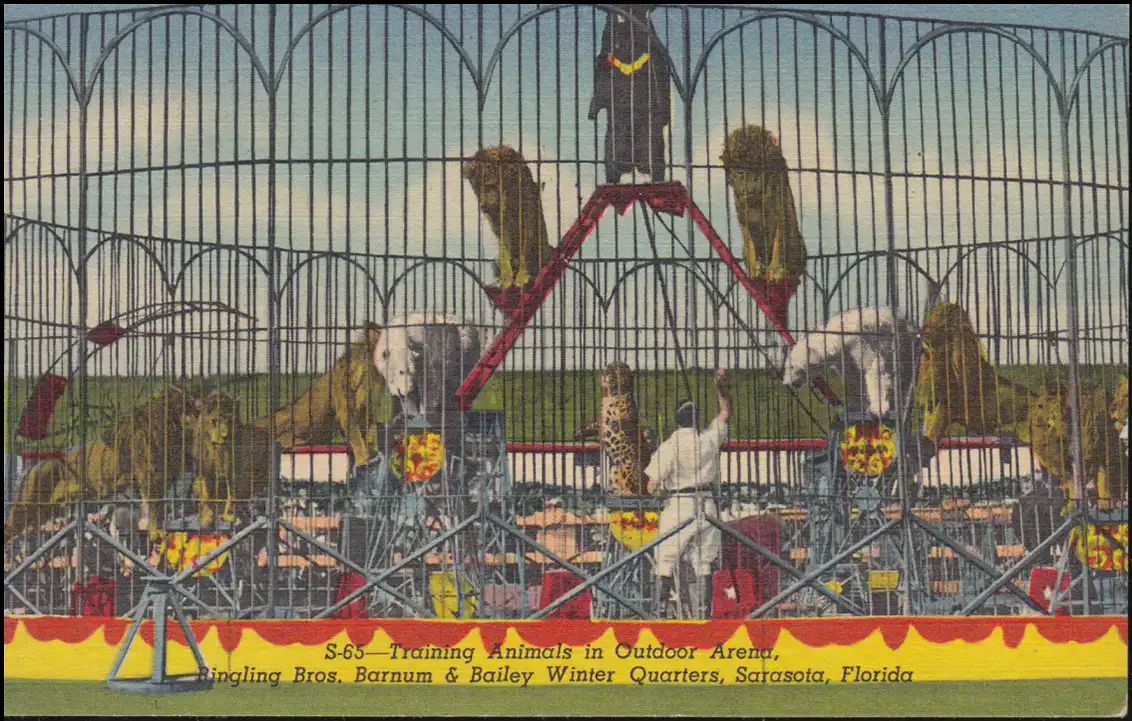 Carte de vue cirque Barnum 1955 dans le camp d'hiver en Floride, SARASOTA 4.10.1955