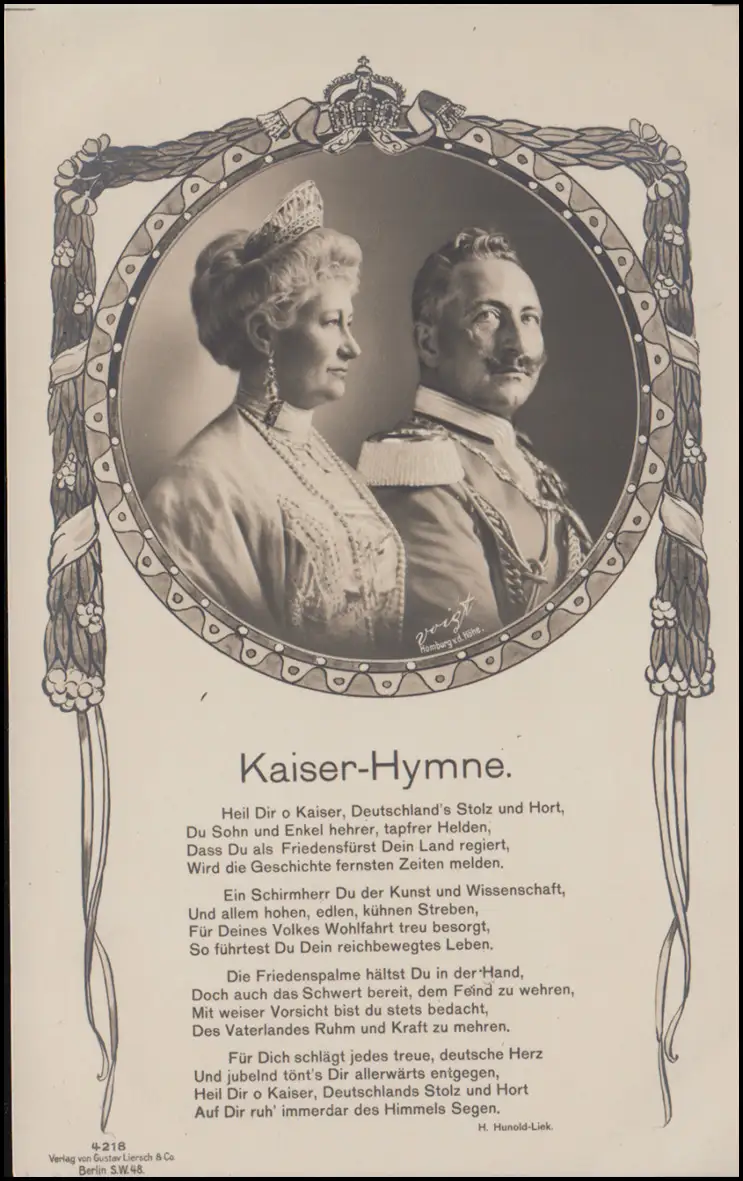 Carte de vue de la paire de l'empereur avec l 'hymne de H. Hunold-Liek, non utilisé