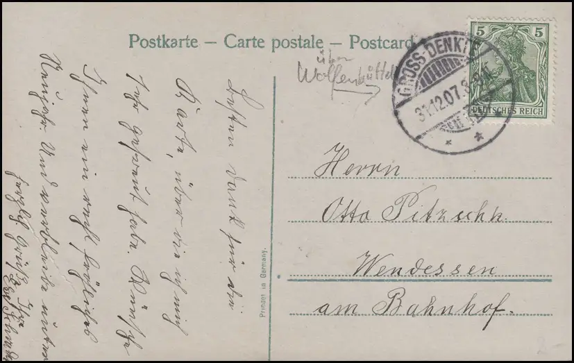 Carte du Nouvel An EF 5 Pf. Germania GRAND-DENKTE (Grand Pensée) 31.12.07 n. Wendensen