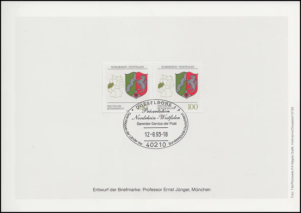 Carte pliante Nous en Rhénanie-du-Nord-Westphalie Armoiries des Länder ESSt DÜSSELDORF 12.8.93