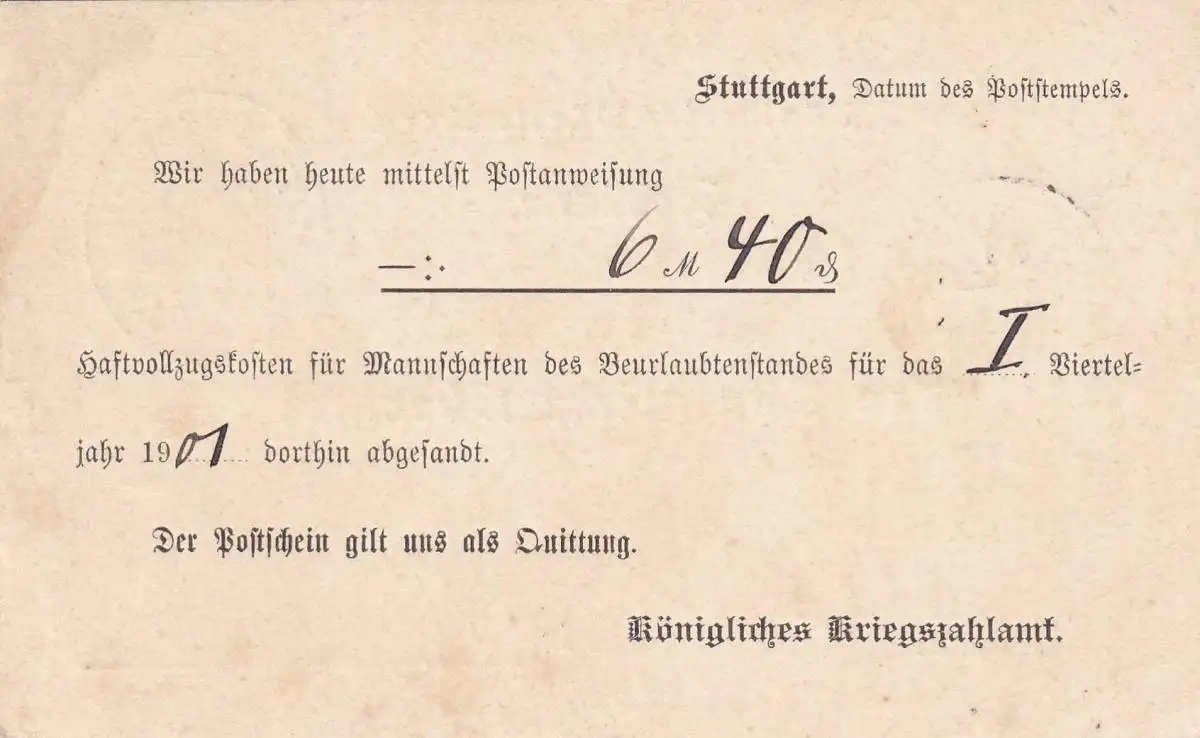 Carte postale 1901 Stuttgart Frais de détention à Neuchâtel, Militaria