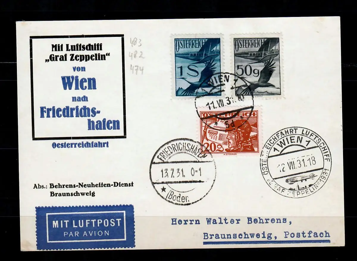 Carte postale 1931 Aéroport de Graf Zeppelin Wien-Friedrichshafen, Autriche