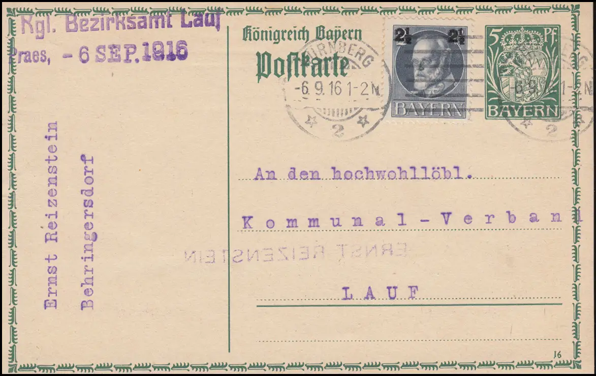 Carte postale Bayern P 93/03 avec ZF111A de NÜRNBERG 6.9.1916 après course