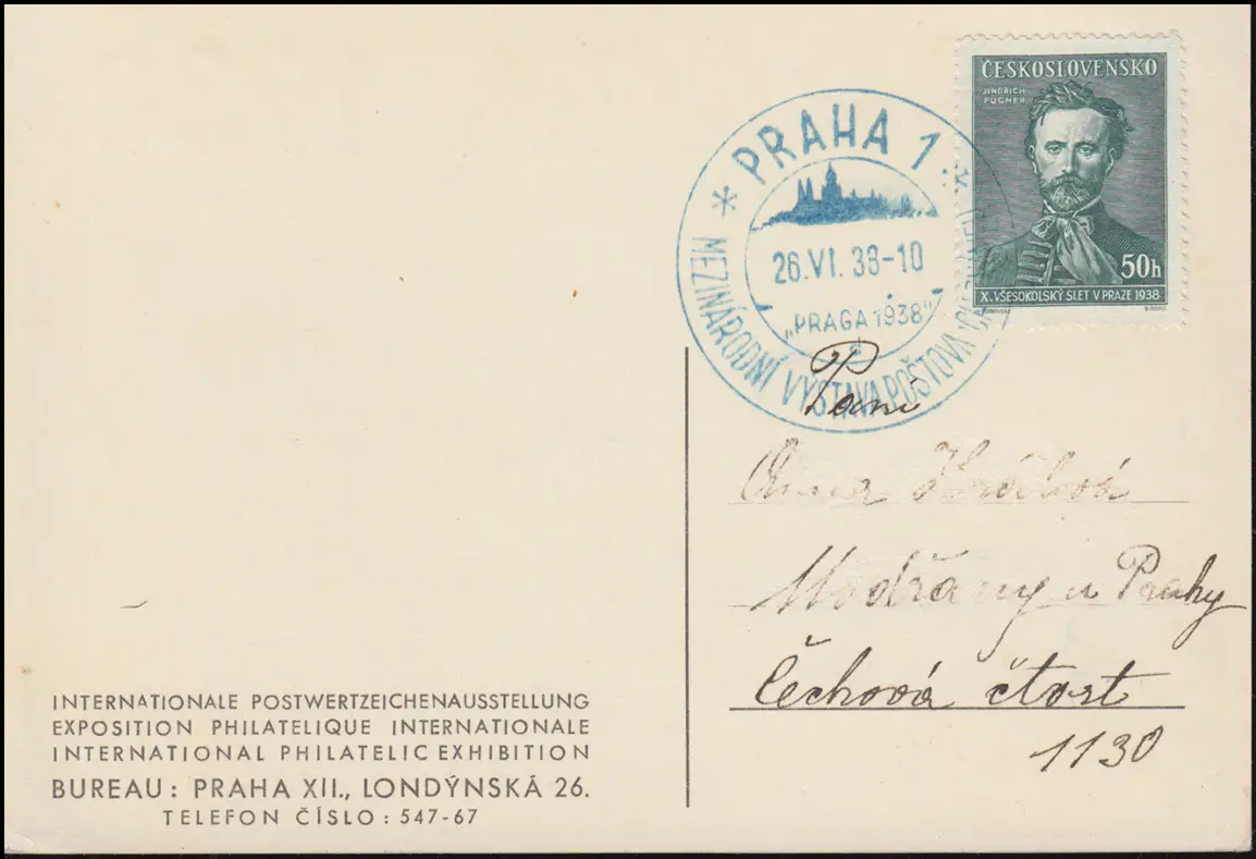 Carte postale Exposition de timbres PRAG 1938 avec SSt PRAHA 26.6.1938