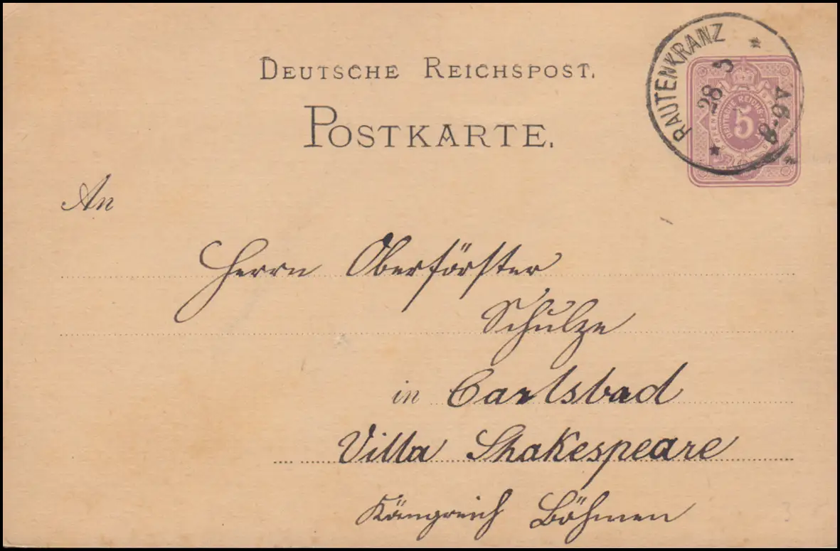 Carte postale P 10, paragraphe 5, de RAUTENKRANZ 28.5.1880 vers Karlovy Vary / Bohême