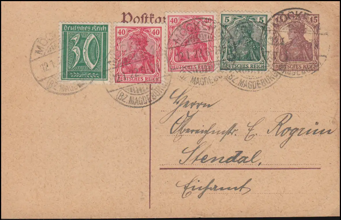 Carte postale P 116I avec supplément Germania et paragraphe MÖCKER 12.1.22 par Stendal