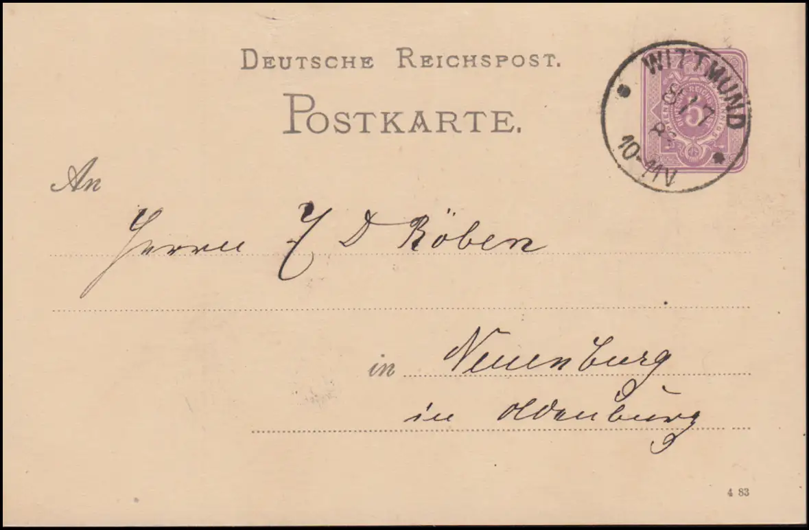 Carte postale P 12/01A, paragraphe 5 Pfennig DV 4 83, WITTMUND 8.8.1883 vers Neuchâtel