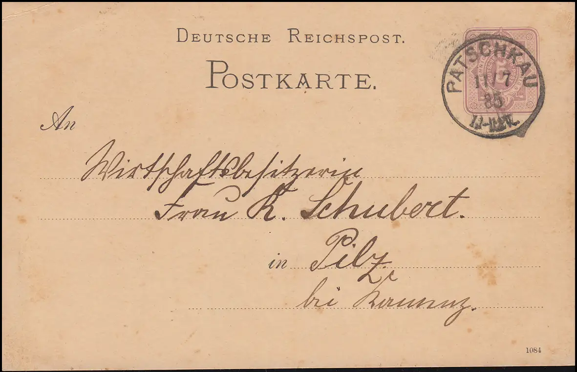 Postkarte P 12/02B Ziffer 5 Pfennig DV 1084 von PATSCHKAU 11.7.1885  nach Pilz