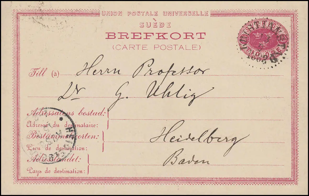 Carte postale P 13 BREFFORT, CRISTIANSTAD 3.9.1888 vers HEIDELBERG 15.9.88