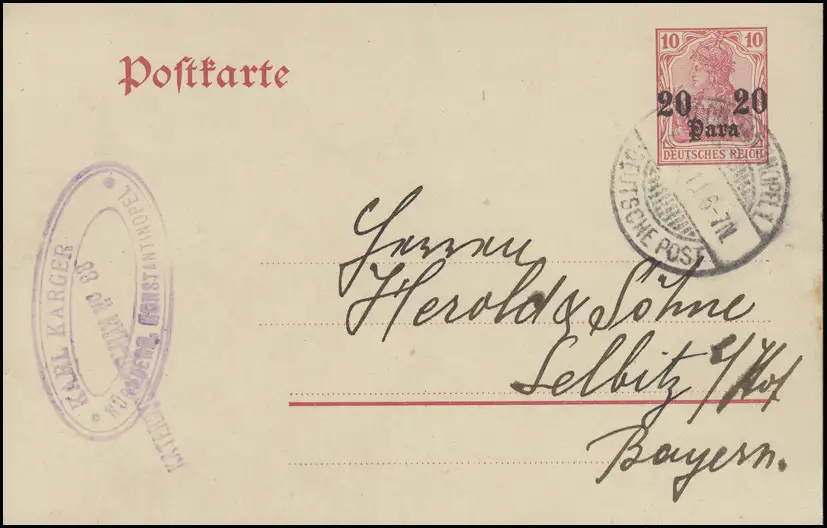 Carte postale P 14 20 Para sur 10 Pf, Constantinople Deutsche Post 31.1.11