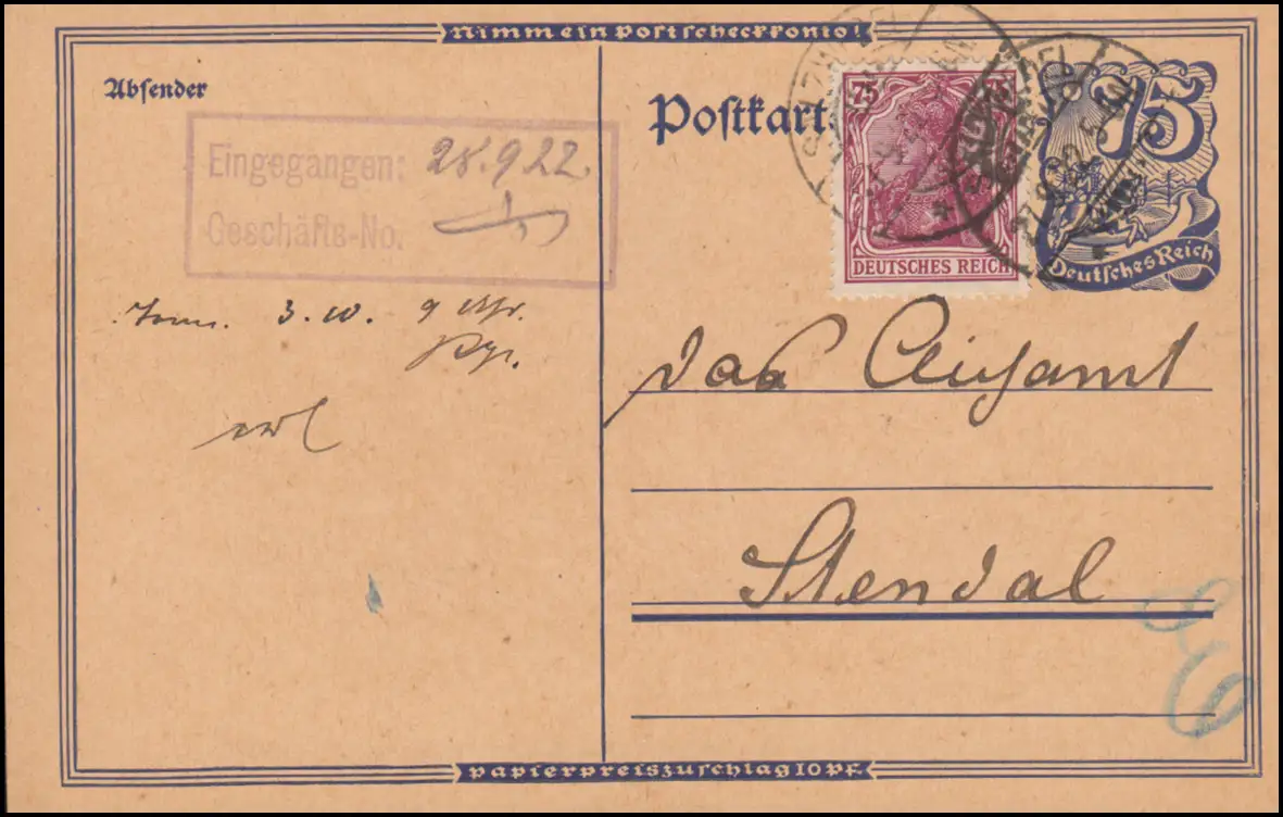 Carte postale P 146I avec supplément de 148II SALZWEDEL 27.9.22 au service d'étalonnage de Stendal