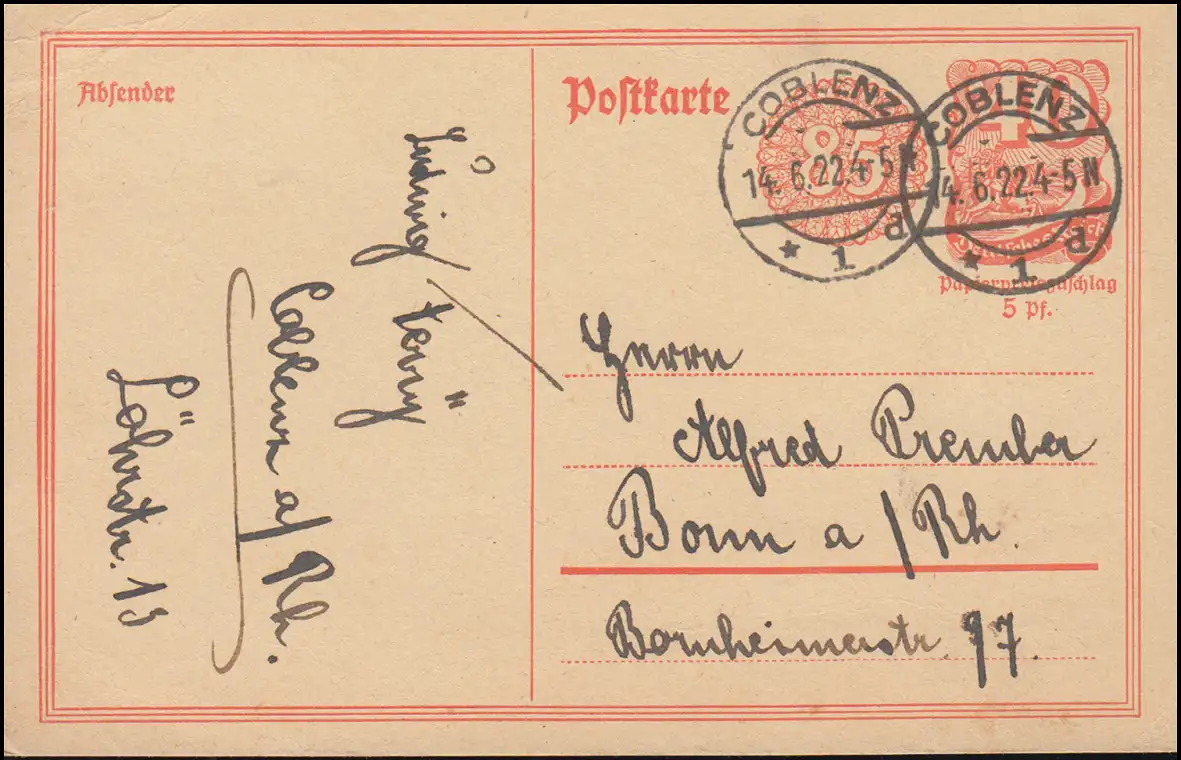 Carte postale P 153I Poseier avec l'empreinte rosace COBLENZ 1 - 14.6.1922 vers Bonn