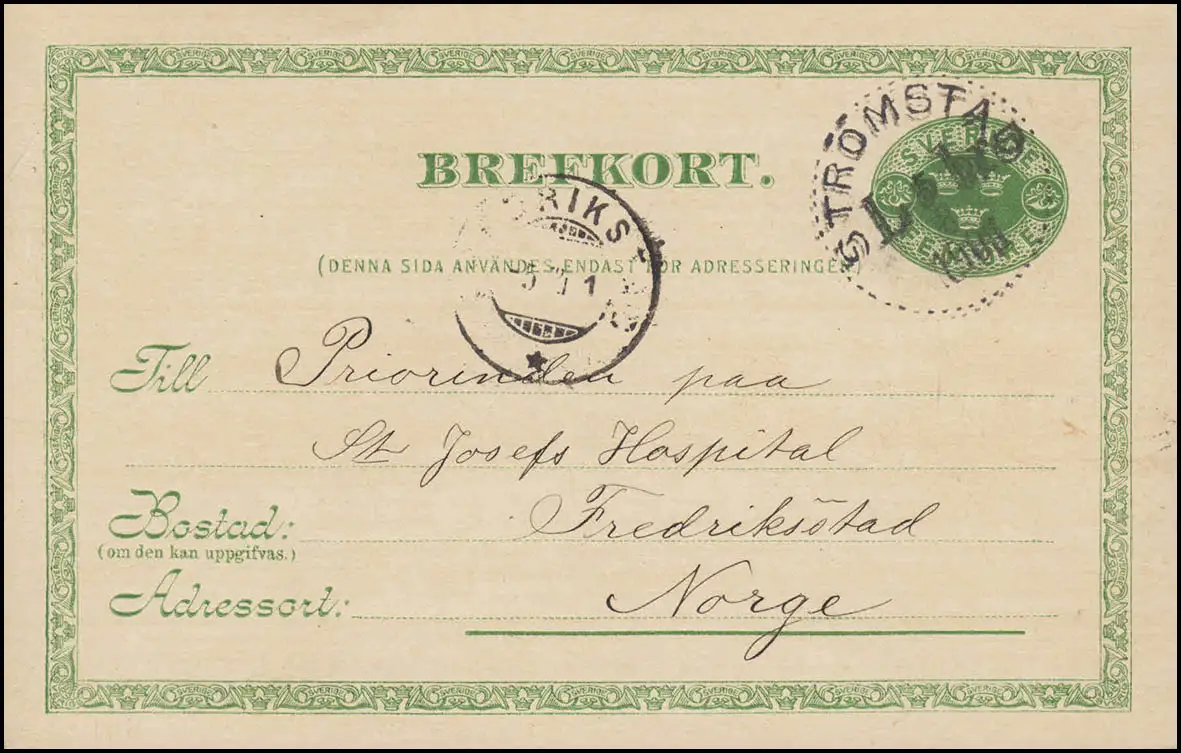 Carte postale P 17 BREFKORT 5 Öre, STRÖMSTAD vers Fredrikstad / Norvège