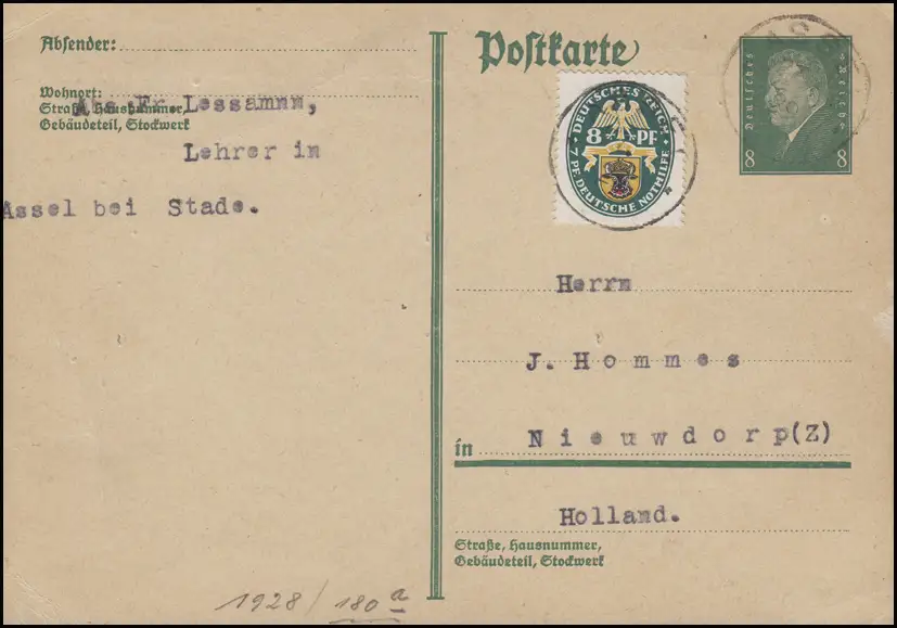 Carte postale P 180I Ebert 8 p. avec 428 armoiries 8 Pf. ASSEL Juillet 1929 vers la Hollande
