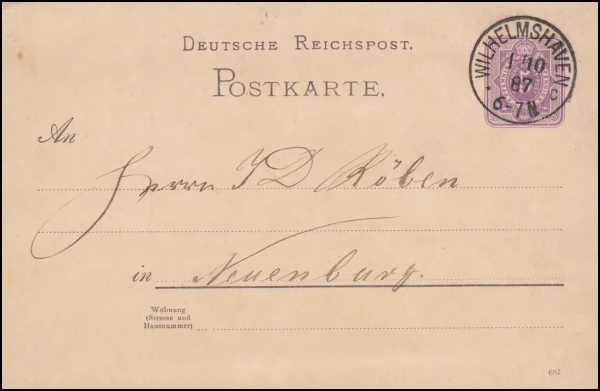 Carte postale P 18I, paragraphe 5 Pfennig DV 687, WILHELMSHAVEN 1.10.1887 vers Neuchâtel