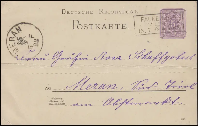 Carte postale sans point noir dans la 4ème ligne, avec impression 288, en tant que carte postale à distance avec cachet "FALKENHAIN BZ. LEIPZIG 13.4.88" vers Meran / Porte du Sud avec timbre d'arrivée Tampon en cercle MERAN 17.7.88. N° de catalogue: P18II Vérification: original Numéro d ' article: 00000000033200