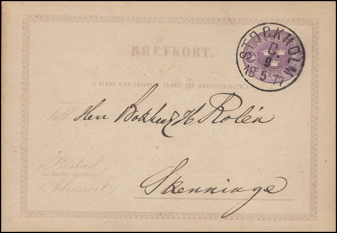 Carte postale P 1D BREFFORT 6 Öre STOCKHOLM 9.5.1877