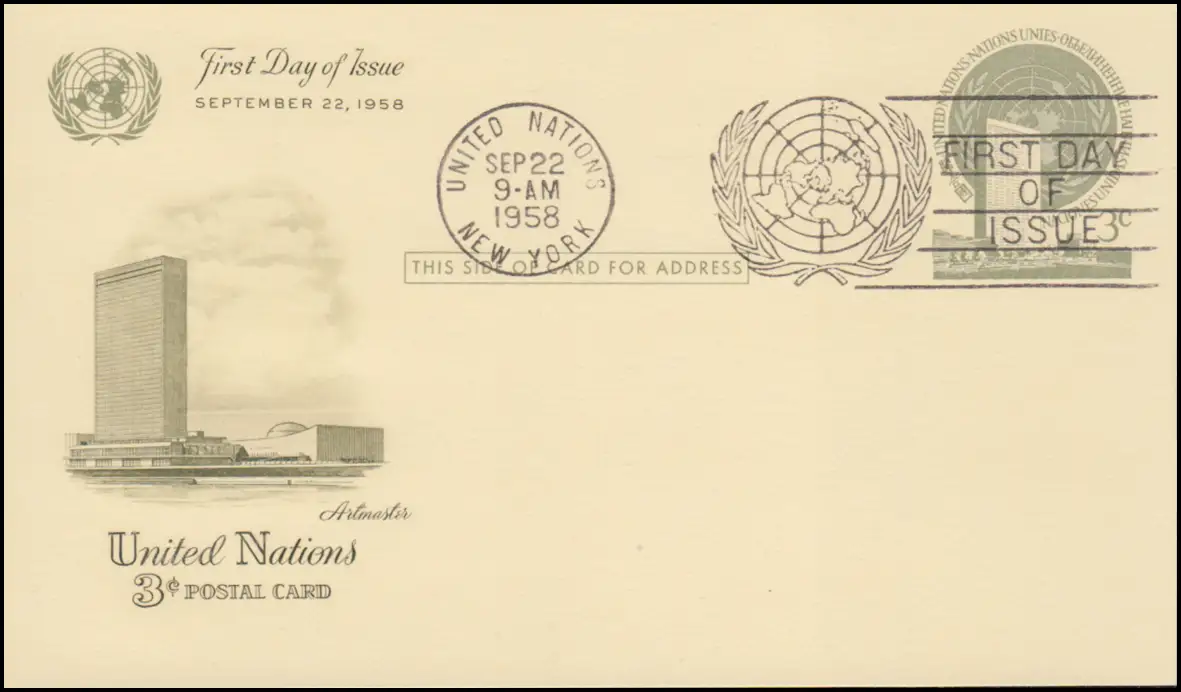 Carte postale P 2 de l'ONU sous le nom de FDC 22.9.1958 bijoux privés