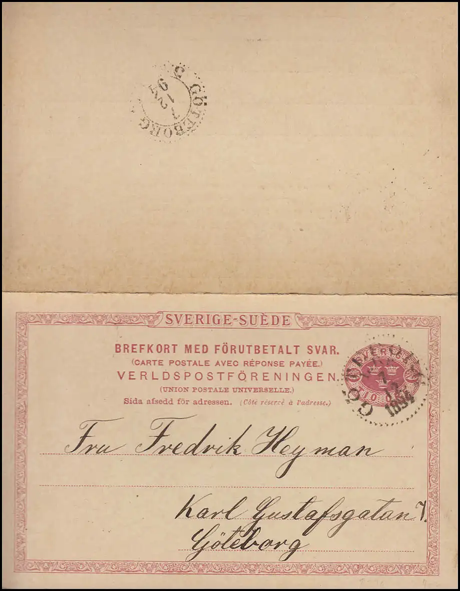 Carte postale P 22 SVERIGE-SUEDE 10/10 Öre, GÖTEBORG 7.12.1894 en tant que double carte locale