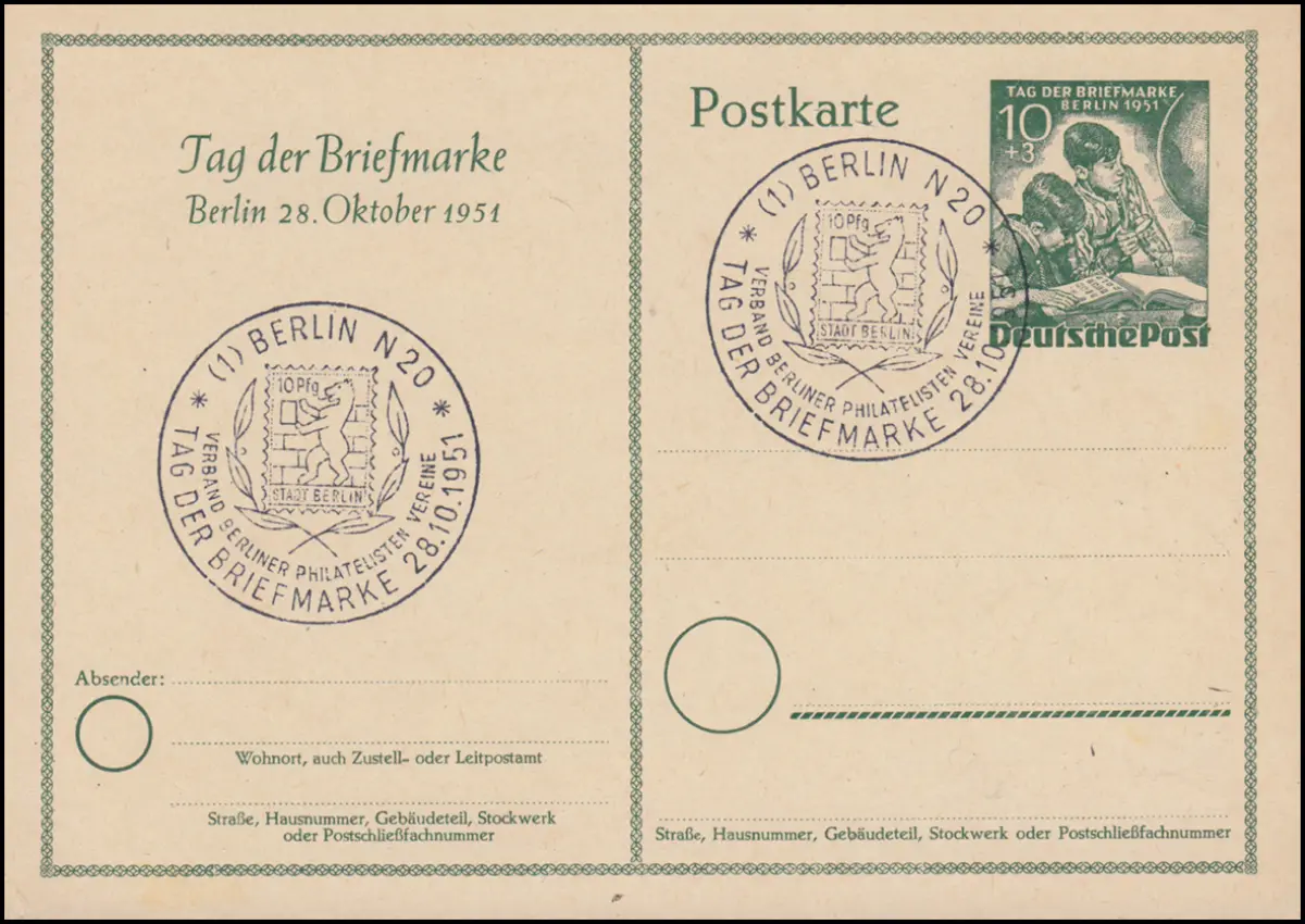 Carte postale P 27 Jour du timbre en blanc FDC avec ESSt BERLIN T.d.B. 28.10.51