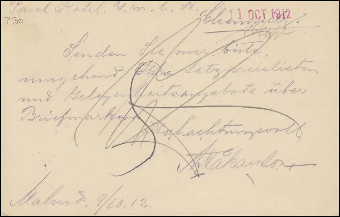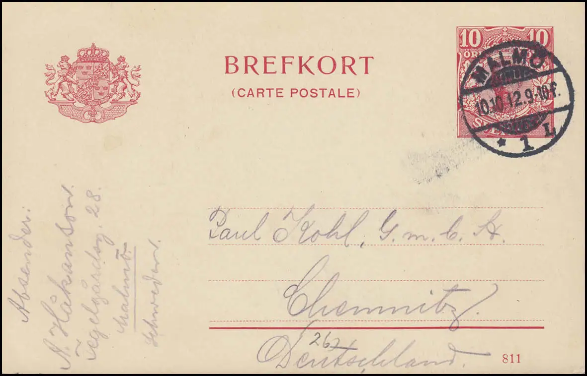 Carte postale P 30 BREFKORT Roi Gustav 10 Öre DV 811, MALMÖ 10.10.12 vers Chemnitz