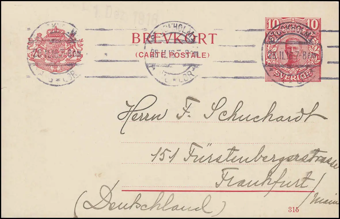 Carte postale P 30 BREFKORT Roi Gustav avec DV 315, STOCKHOLM 29.11.1916