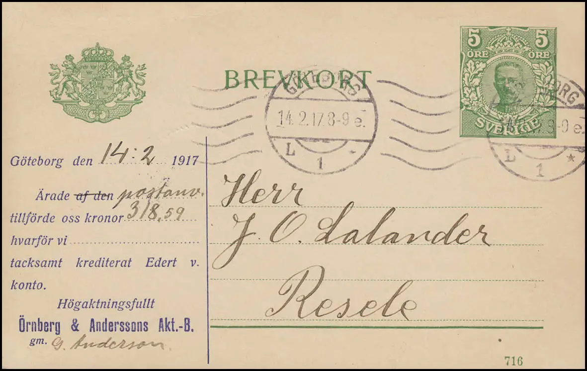 Carte postale P 32 BREVKORT 5 Öre Date d'impression 716, GÖTEBORG 14.2.17 selon RESELE 16.2.